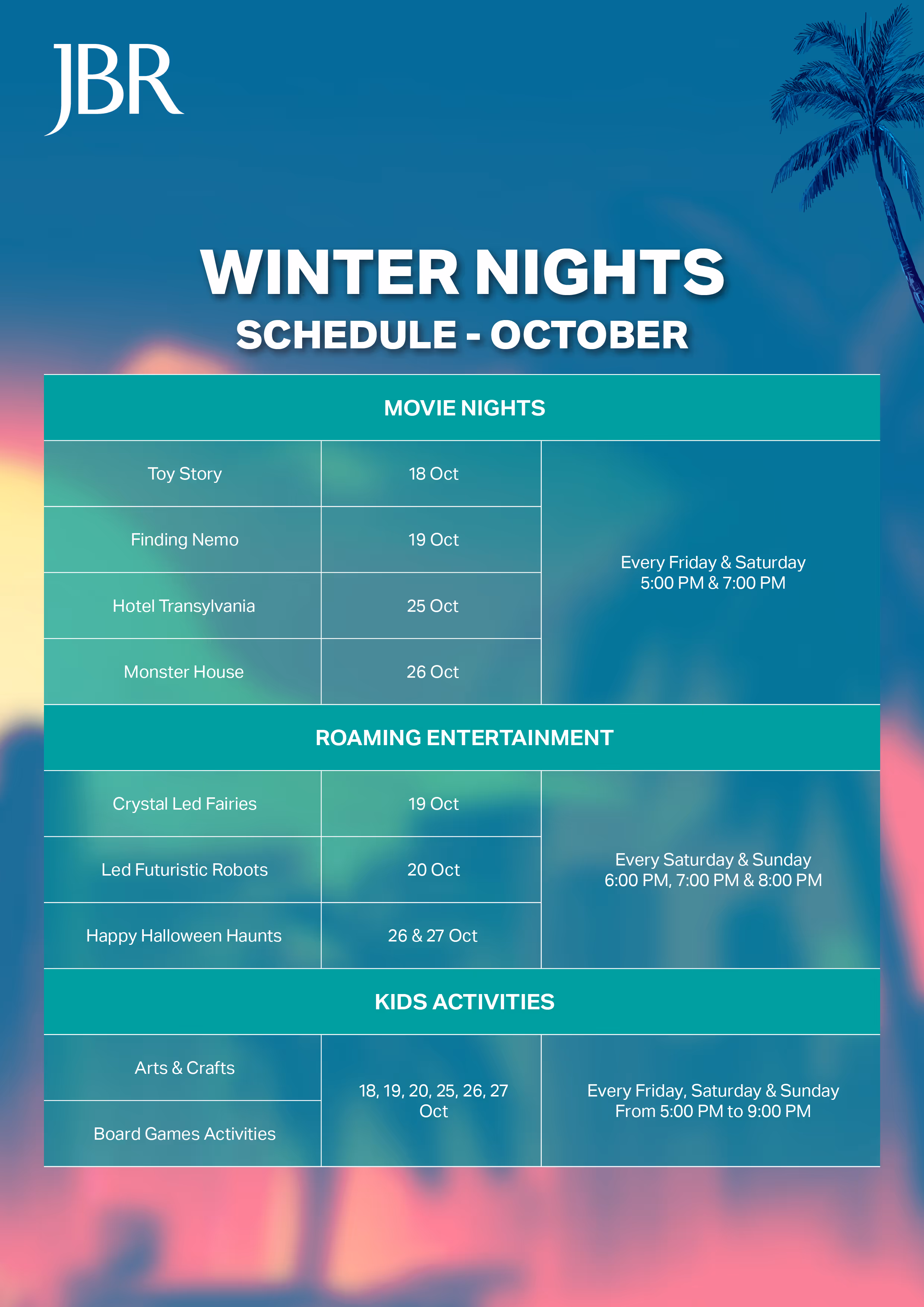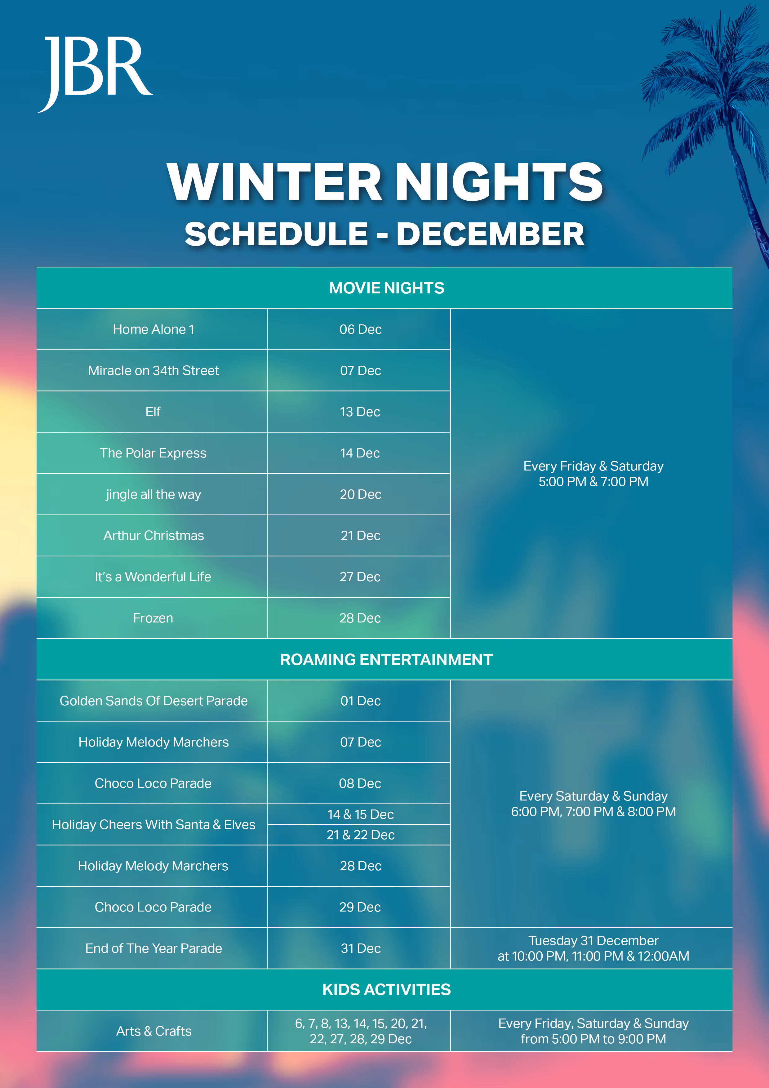 كما يمكن للأطفال الصغار إطلاق العنان لإبداعهم في ورش الفنون والحرف اليدوية ذات المواضيع المختلفة كل يوم سبت وأحد من الساعة 5 إلى 9 مساءً. بالإضافة إلى ذلك، يمكن للزوار الاستمتاع بالترفيه الجوال المتنوع يومي السبت والأحد. تعد ليالي الشتاء في جي بي آر بتقديم المرح للجميع