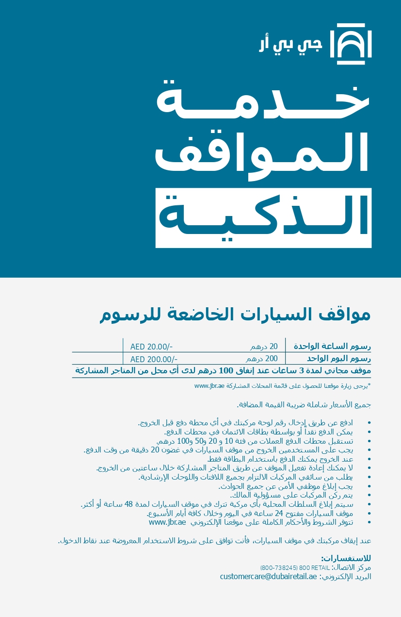 • موقف مرجان في جي بي ار - الحد الأدنى للإنفاق 100 درهم إماراتي تطبق الشروط والأحكام أعلاه.