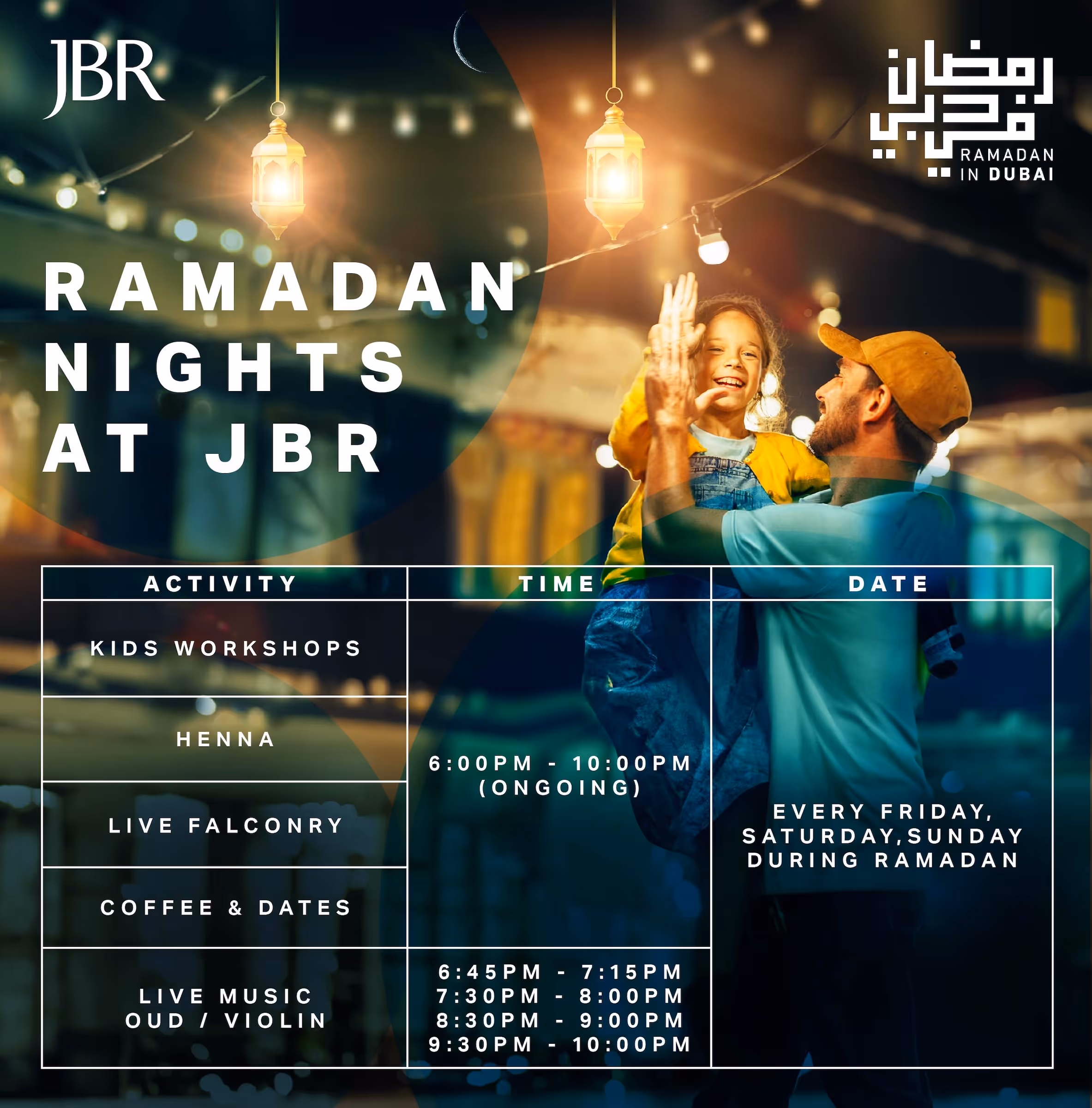 استمتع بأجمل الأجواء الرمضانية في جي بي آر واختبر مجموعة متنوعة من الأنشطة والفعاليات التي تقام خلال عطلات نهاية الأسبوع ابتداءً من 15 مارس و حتى 7 أبريل ، من الساعة 6:30 مساءً حتى 10 مساءً. مع تشكيلة متنوعة من الفعاليات التي تشمل ورش عمل الأطفال الممتعة بطابع رمضاني، ومحطات فن الحناء، وعروض الصقارة المميزة، وعروض آلة العود الموسيقية الحية، إلى جانب تقديم التمور والقهوة العربية مجانًا لإسعاد زوارنا، هناك شيء للجميع للاستمتاع به!